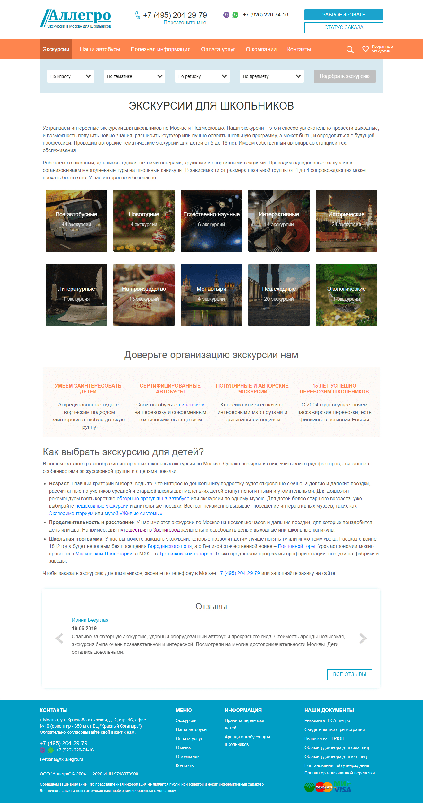 Создание дизайна, оптимизация, копирайтинг, управление репутацией, ведение контекстной рекламы и соц. сетей для сайта по организации школьных экскурсий в Москве.