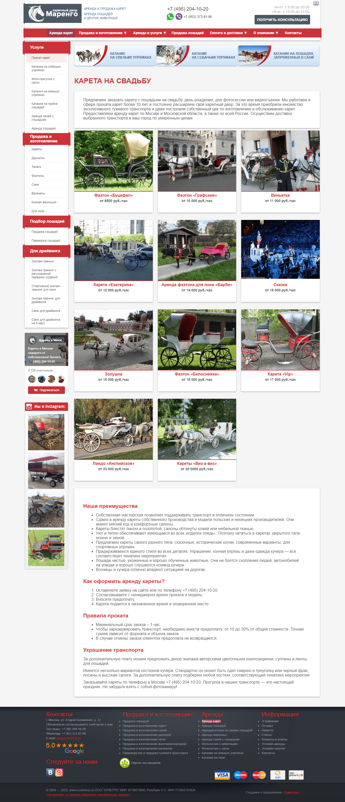 Создание дизайна, оптимизация, копирайтинг, управление репутацией, ведение контекстной рекламы и соц. сетей для сайта по аренде и продаже карет в Москве.