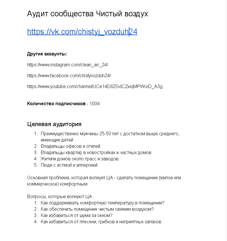Внешний и внутренний аудит аккаунтов социальных сетей компании по продаже и установки вентиляционных систем.