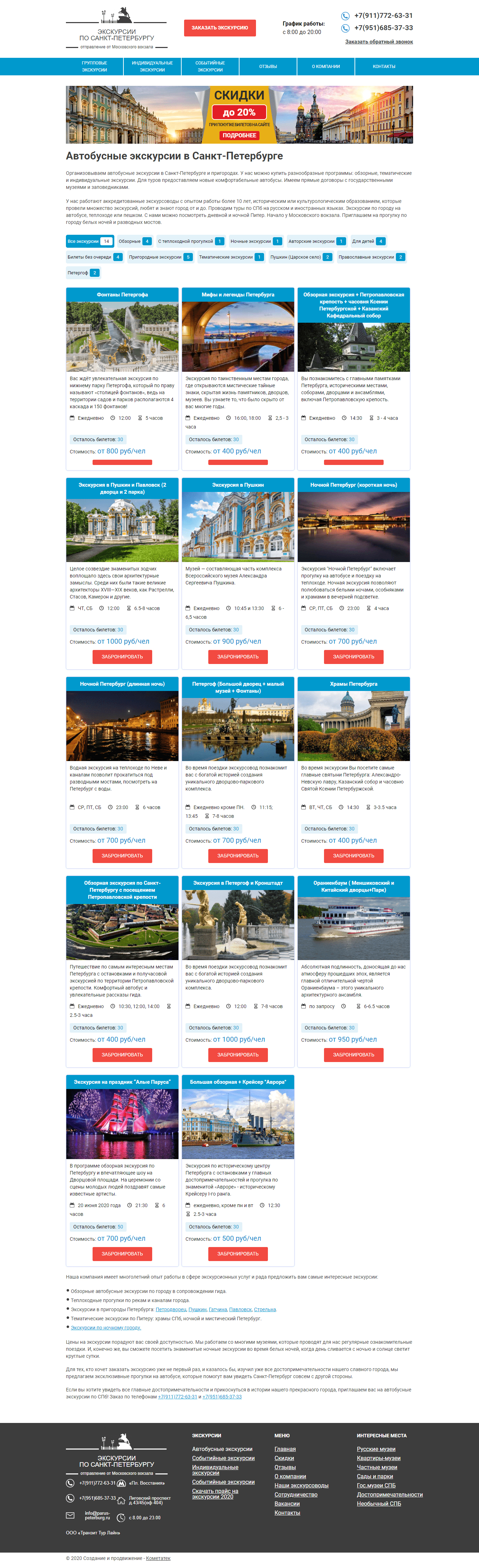 Создание дизайна, оптимизация, копирайтинг, управление репутацией и ведение контекстной рекламы для сайта по организации автобусных экскурсий в Санкт-Петербурге.